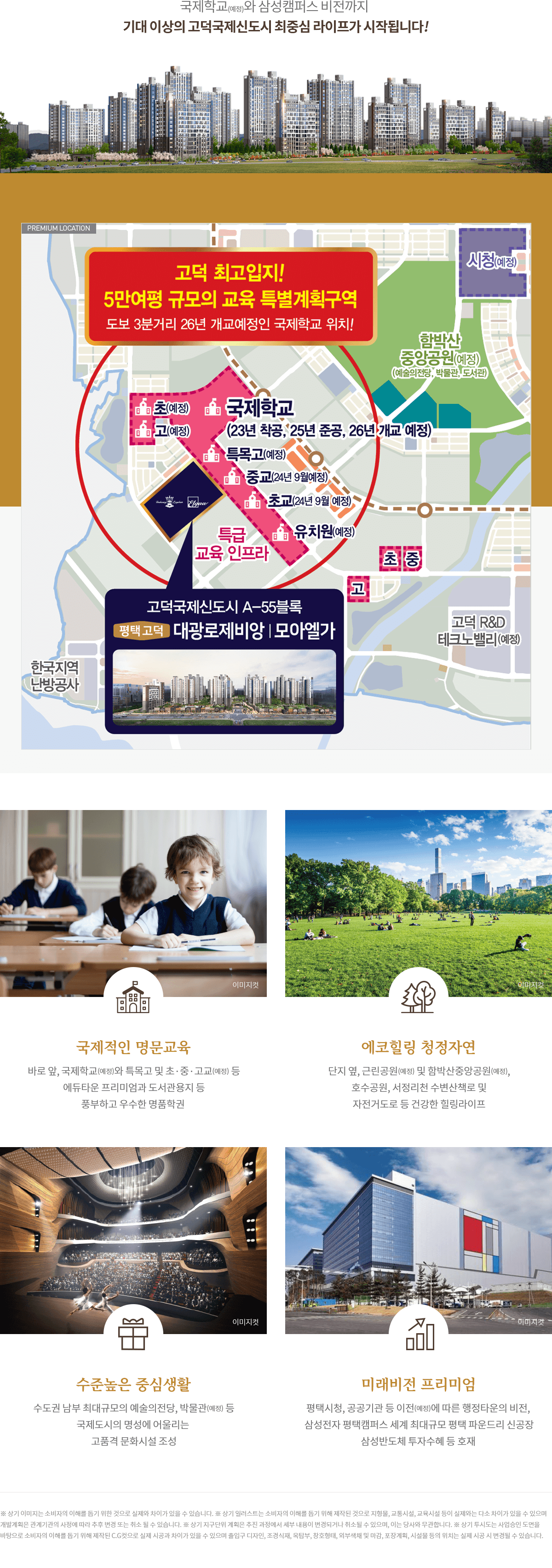 평택 고덕 A55 대광로제비앙 모아엘가는 2025년 4월 준공된 단지로 단지명은 '고덕국제신도시 로제비앙&모아엘가 에듀센트럴'로 단지명만 20자입니다. 그중 주목할 부분은 '에듀센트럴'입니다. 아래서 입지를 살펴보면 아시겠지만, 초중고등학교, 그리고 국제학교가 단지를 둘러싸고 있어 에듀타운의 대장단지로 불리는 곳입니다. 그럼, 리뷰 시작합니다.