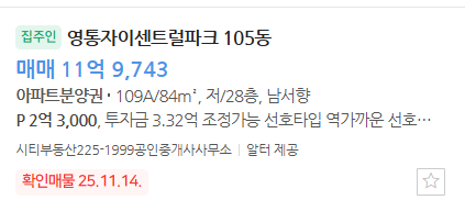 - 북수원자이렉스비아(2024년 3월 준공, 2607세대)를 비교 단지로 잡았습니다. 세대수가 비슷한 신축단지로 1호선 성균관대역은 멀지만, 동인선 106역과 가까운 단지입니다. 입주장이 끝나 정상매물의 호가를 확인할 수 있습니다. 비교가치는 9.68억으로 안전마진은 없습니다.
