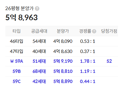 - 59A타입(51세대) : 5.91억