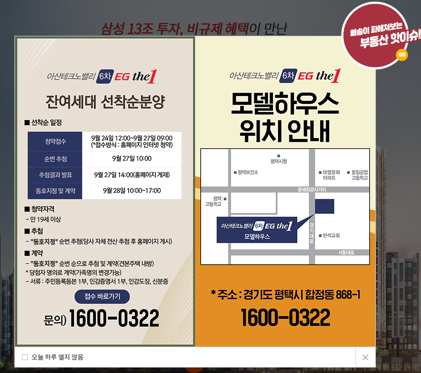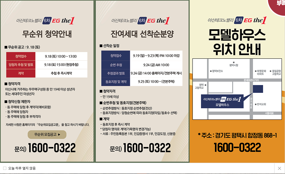 오늘은 아산 테크노밸리 6차 이지더원 선착순계약 정보를 살펴보겠습니다. 아산 테크노밸리 6차 이지더원은 충청남도 아산시 둔포면 석곡리 1822 (아산 테크노밸리 Ab5 블록)에 위치합니다. 아산 테크노밸리 6차 이지더원은 최고 25층, 12개동, 총 822세대 규모입니다. 지난 8월 24일 1순위 청약을 받았고, 무순위 청약을 9월 18일에 아산시민을 대상으로 진행하였습니다. 이후 선착순분양은 9월 19일부터 23일까지 순번을 홈페이지로 접수하고, 24일에 선착순계약을 진행하기로 했었습니다. 홈페이지에 공고가 없어서 상담전화로 문의를 하게되었고, 홈페이지 문제로 전화로 순번을 접수 받는다고까지 안내를 받았는데요. 선착순계약을 진행하기로 했던 24일까지도 아무 소식이 없고, 상담전화는 받지도 않았습니다. 그리고 24일 18:30무렵에 새로운 선착순 계약 일정관련 문자하나만 왔습니다. 이번에는 홈페이지가 업데이트가 되어있네요. 접수 가능한 것 확인했습니다. 최초로 안내를 드렸던 입장에서 죄송한 마음을 가지고 다시 선착순계약 정보를 올립니다. 지난 무순위 청약 정보를 기준으로 보았을 때, 잔여세대 127세대 중 일부를 공급합니다. 아산 테크노밸리 6차 이지더원은 현재 5000여가구가 입주해 있고, 앞으로 총 8000여가구의 브랜드타운으로 조성될 예정입니다. 아산 자체 직장수요뿐만 아니라, 평택 고덕신도시와의 물리적 거리도 가깝습니다. 저렴한 집값으로 평택거주 수요유입도 예상됩니다. 3면 발코니 확장과 광폭거실, 세대별 창고도 특징이네요. 부동산 지역카페와 유튜브, 호갱노노 등에서 화제가 되었는데요. 비규제지역으로 전국 청약이 가능했기 때문이었습니다. 그럼, 이제 리뷰 시작하겠습니다.